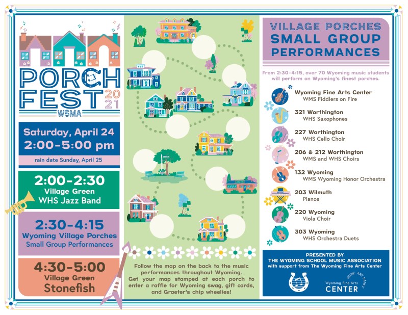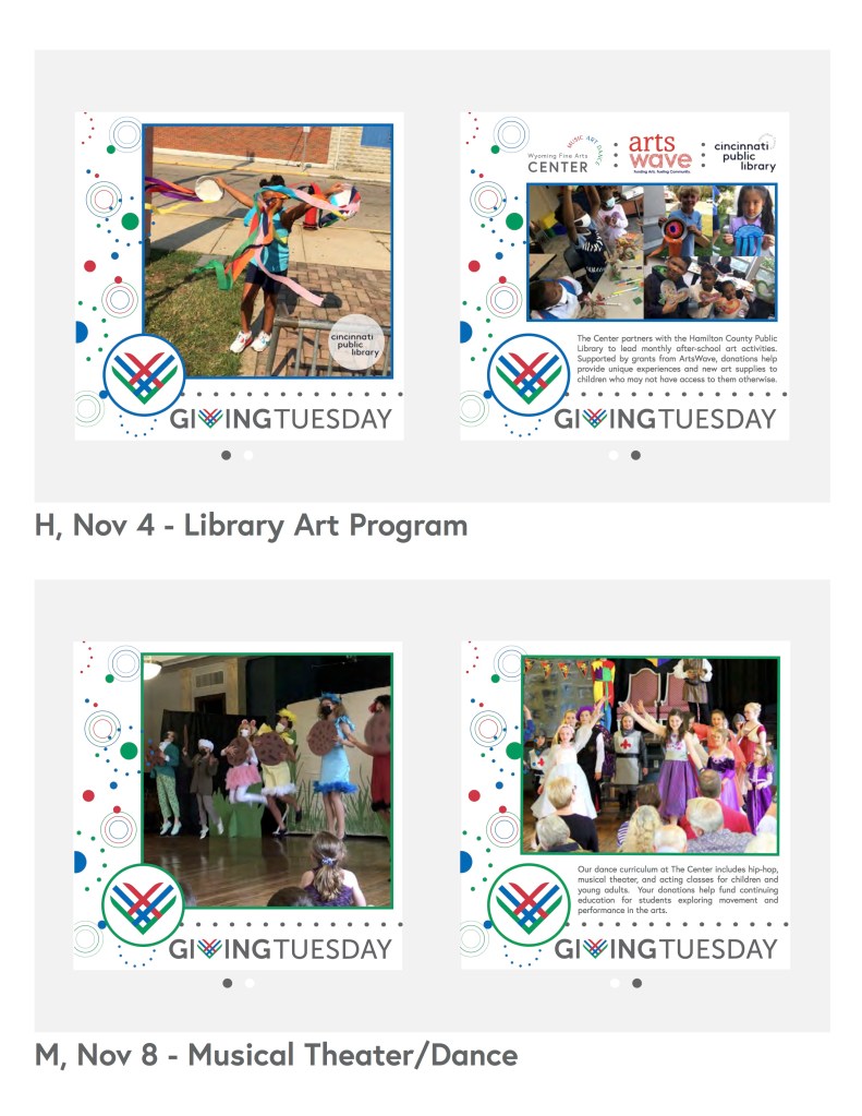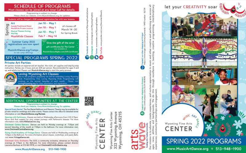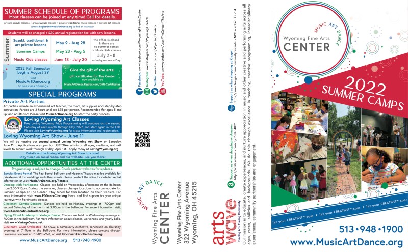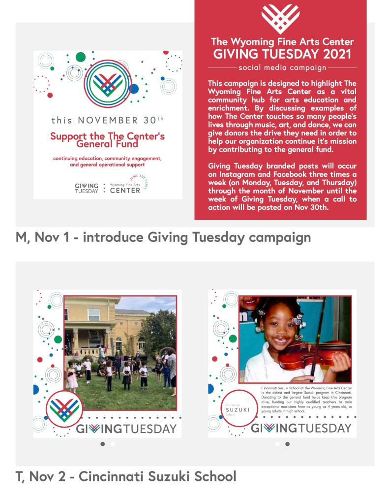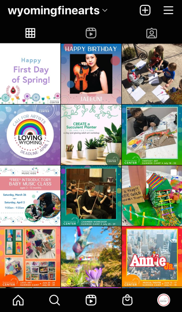 While working for The Wyoming Fine Arts Center, I have created countless designs for digital media and print. Larger projects include creating the 2019-2020 Annual Report, formatting the 2020 Board Guidebook, leading the design team for the WSMA’s Spring and Fall Porchfest maps in 2021, leading the 2021 Giving Tuesday Social Media Campaign, and designing the seasonal program mailers. I have also created graphics for social media, signs around The Center, printed flyers, and designs for Center programs and events.